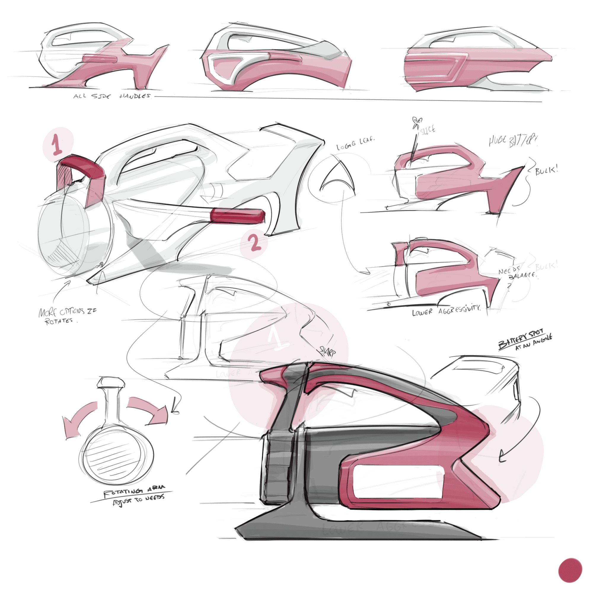 An adjustable secondary handle that rotates along an axis to accommodate different working angles.